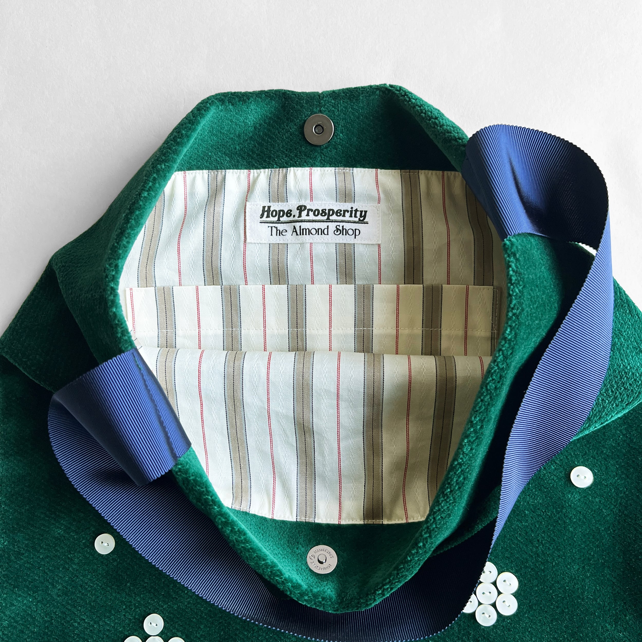 素材はふんわりとした程よい厚みのベロア生地を使用。ベロアならではの光沢感と、滑らかな毛足が特徴的。裏地には上質なジャガード織りのストライプを使用し、雰囲気のある仕上がりに◎