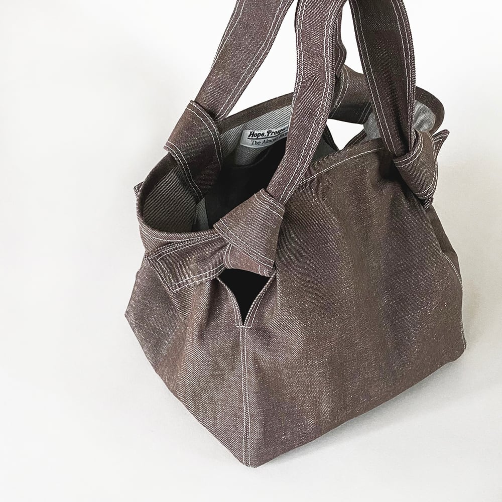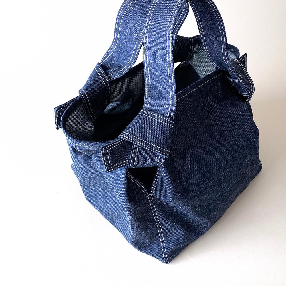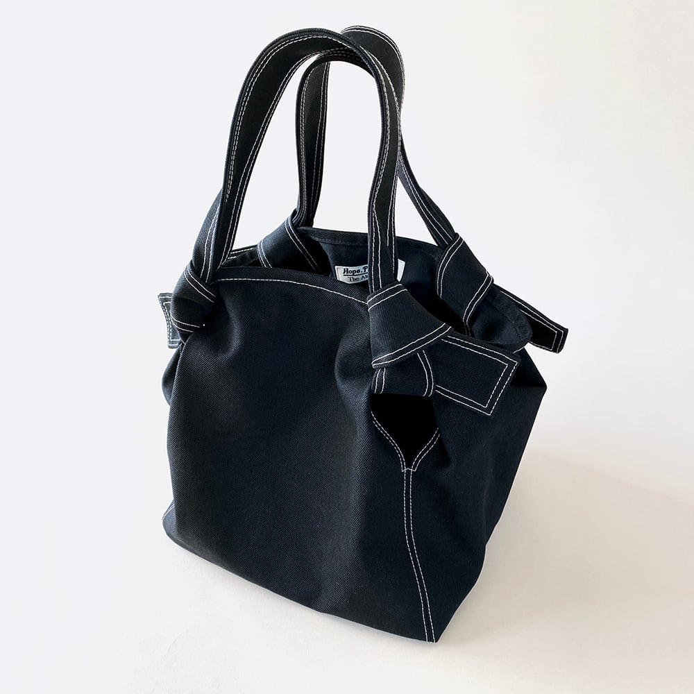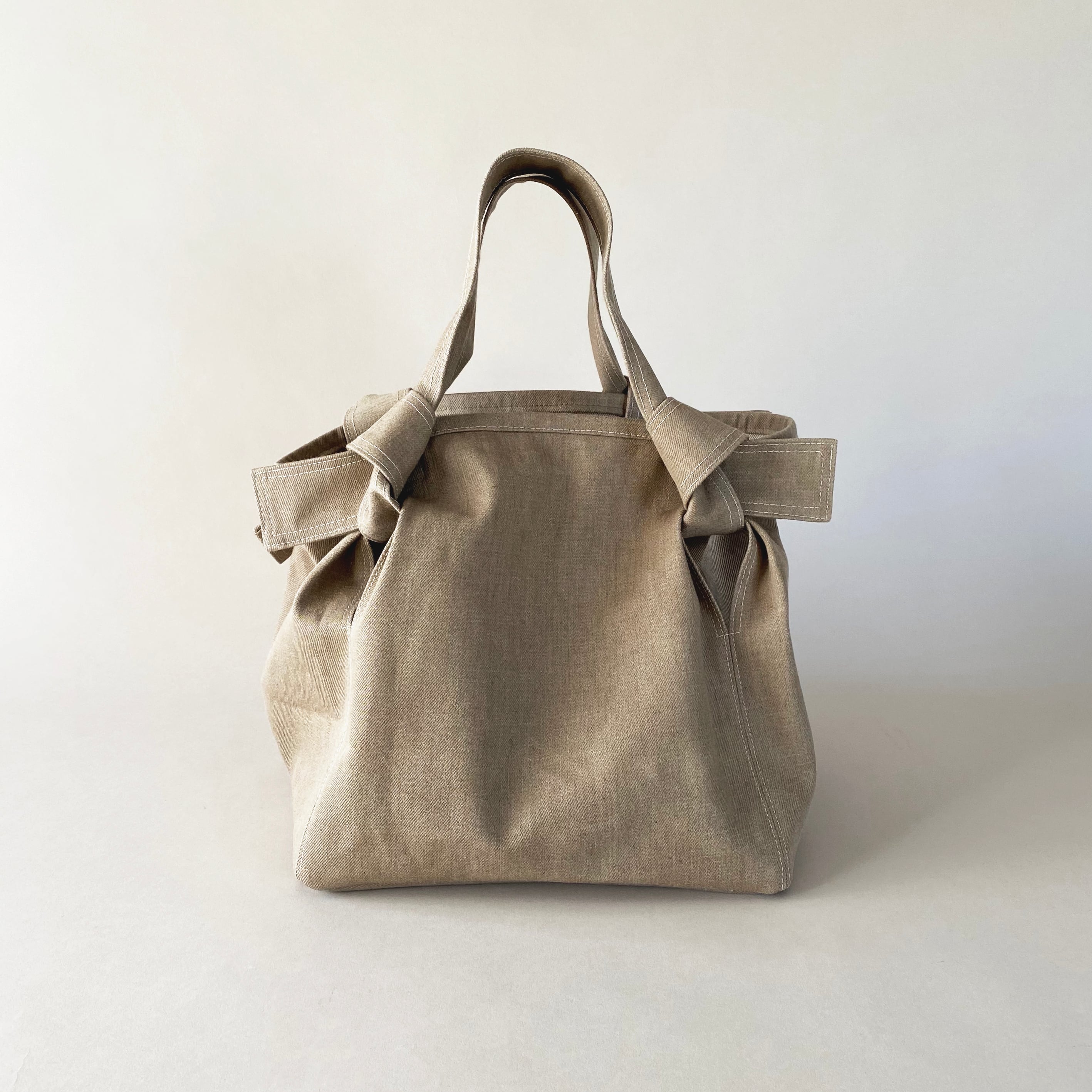 ステッチワークを効かせ、しっかりとした作りでありながら、ギュッと結んだ持ち手と、タックをとることで現れる立体的な膨らみが、程よい甘さと上品な印象を引き立てる。
