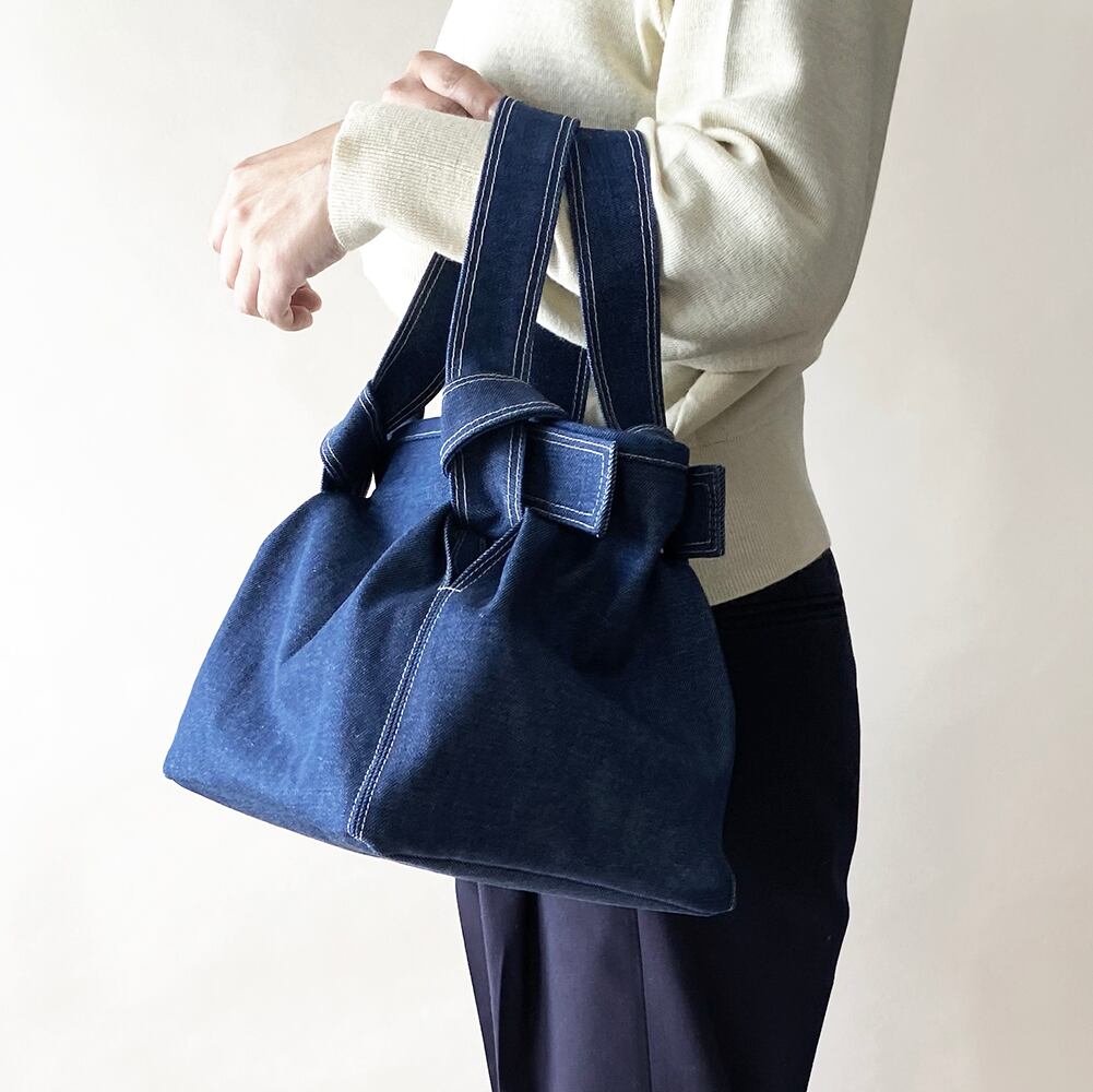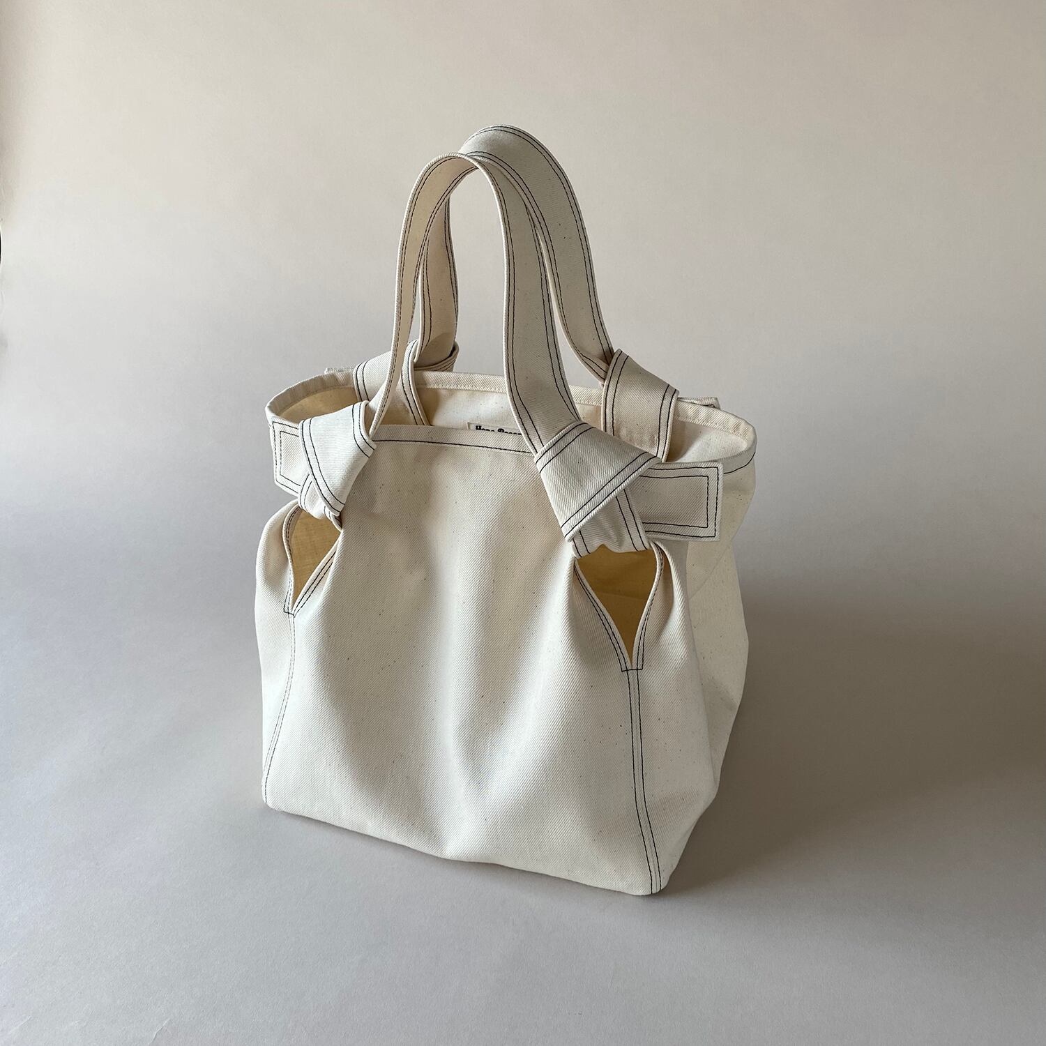 ステッチワークを効かせ、しっかりとした作りでありながら、ギュッと結んだ持ち手と、タックをとることで現れる立体的な膨らみが、程よい甘さと上品な印象を引き立てる。