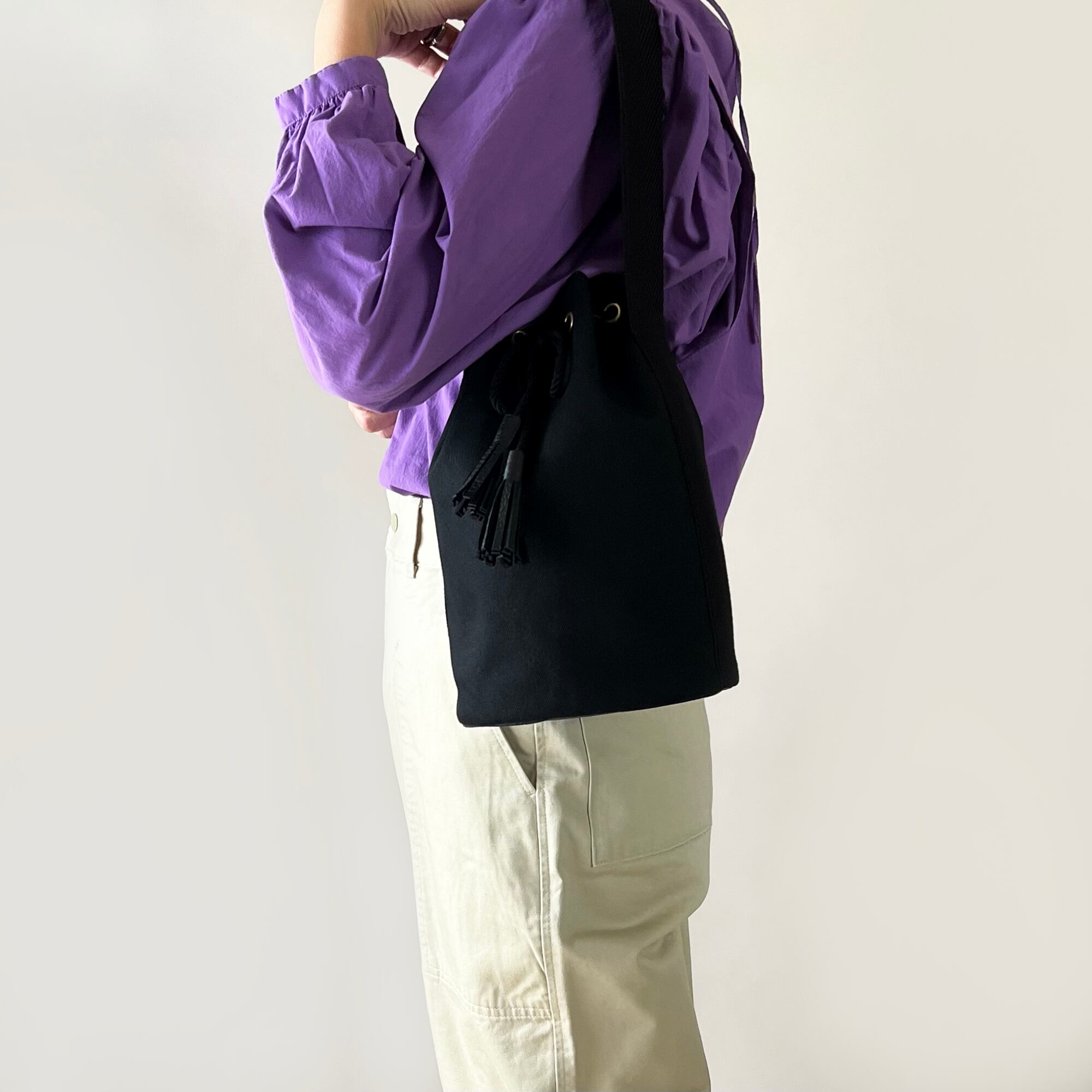 1本の幅広いコットン綾テープが肩から掛けた時のアクセントに。
