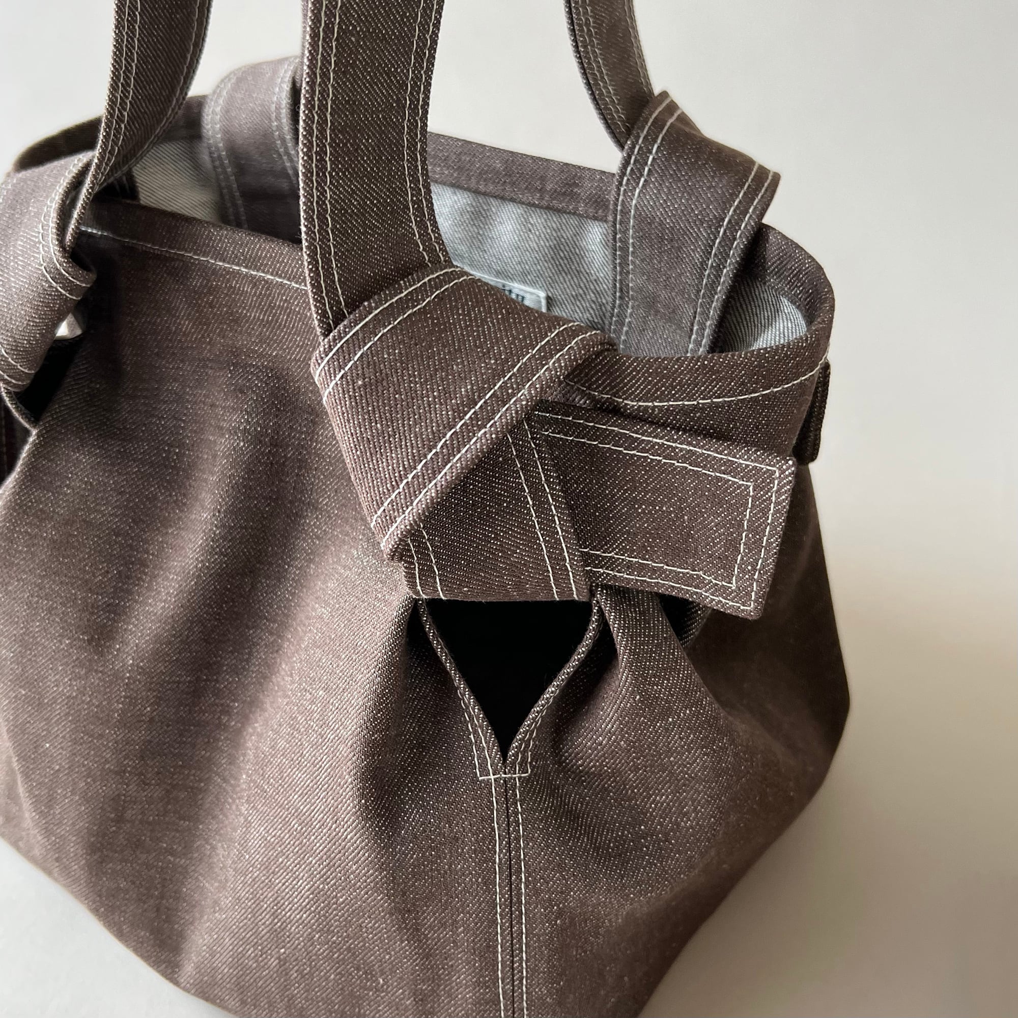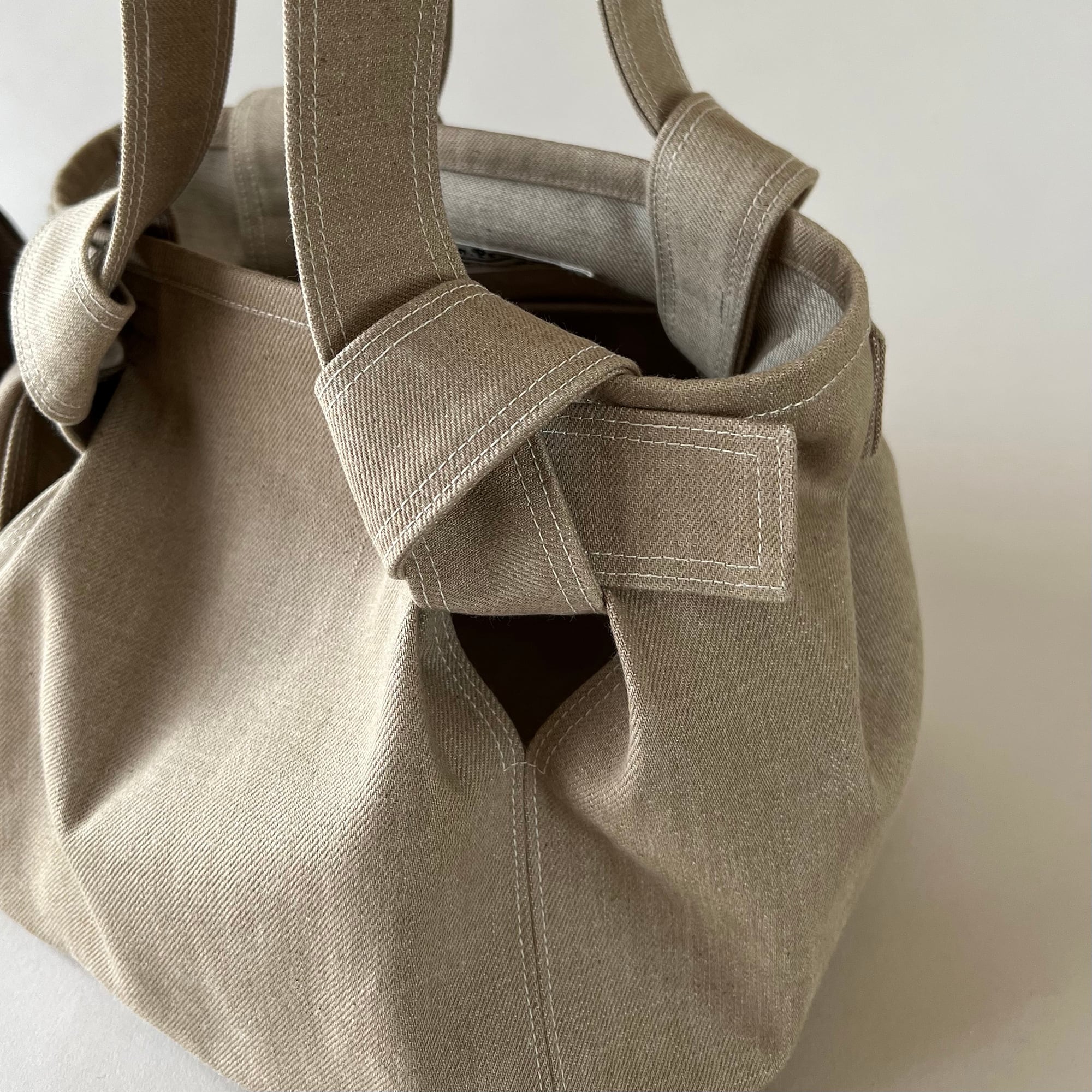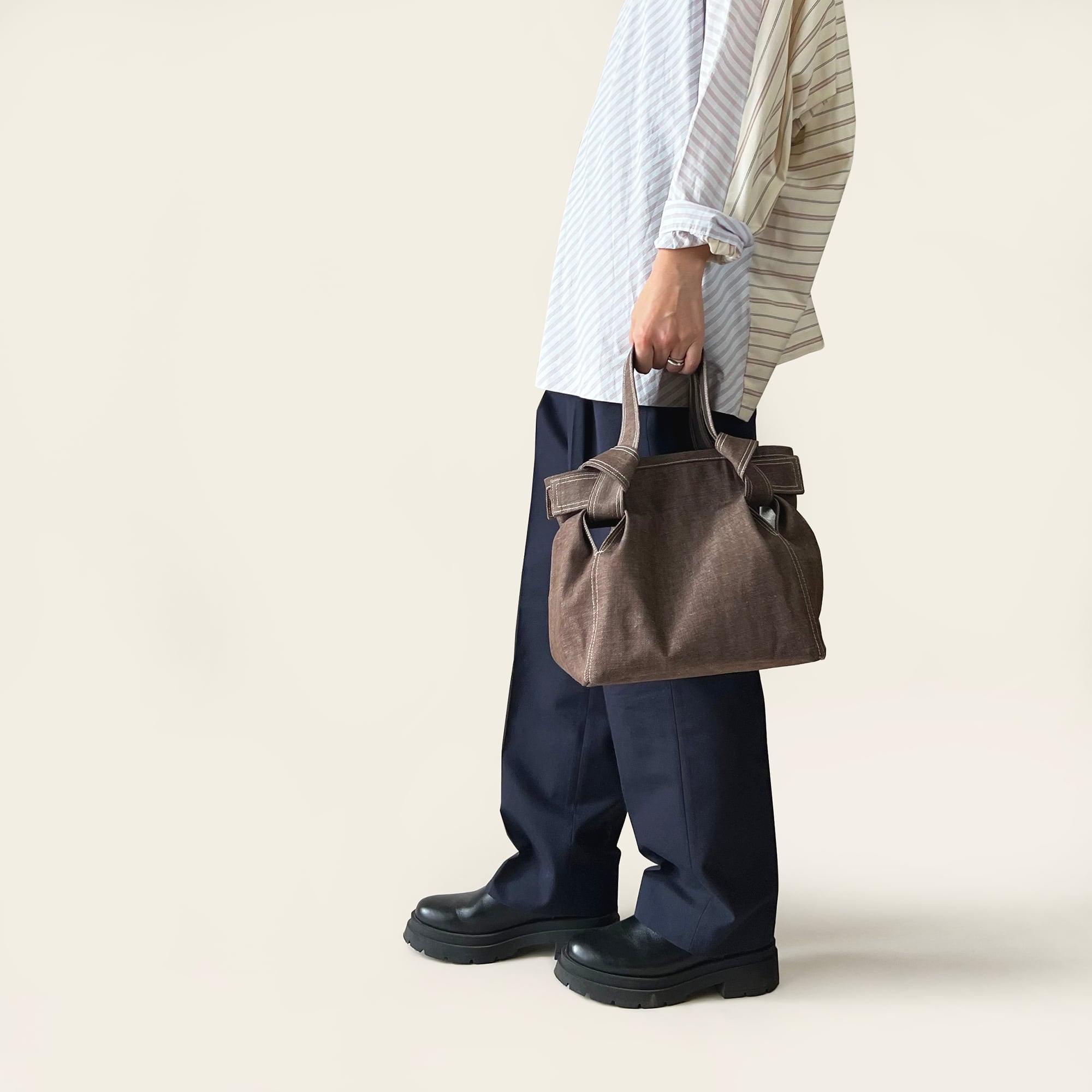 ステッチワークを効かせ、しっかりとした作りでありながら、ギュッと結んだ持ち手と、タックをとることで現れる立体的な膨らみが、程よい甘さと上品な印象を引き立てる。