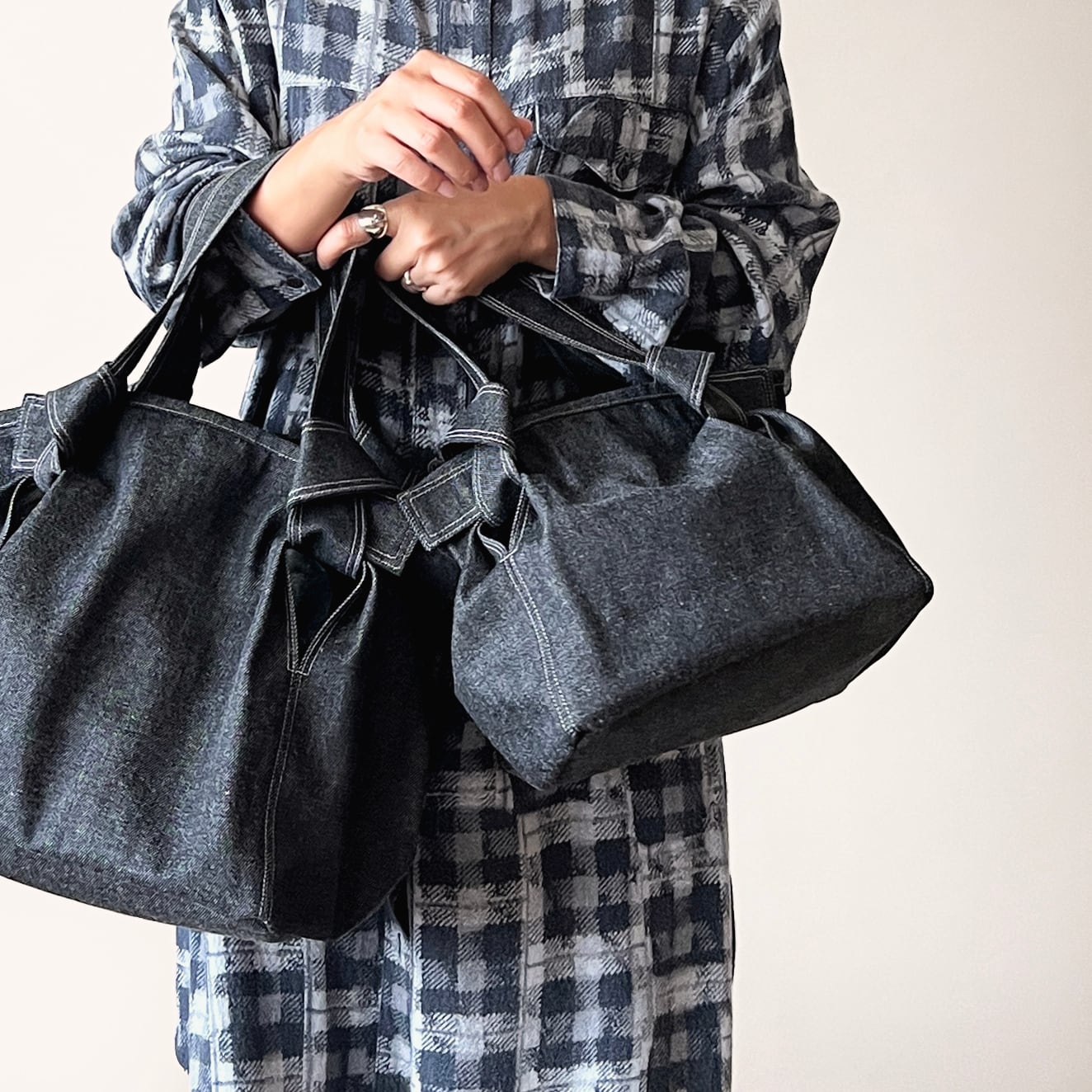 ステッチワークを効かせ、しっかりとした作りでありながら、ギュッと結んだ持ち手と、タックをとることで現れる立体的な膨らみが、程よい甘さと上品な印象を引き立てる。