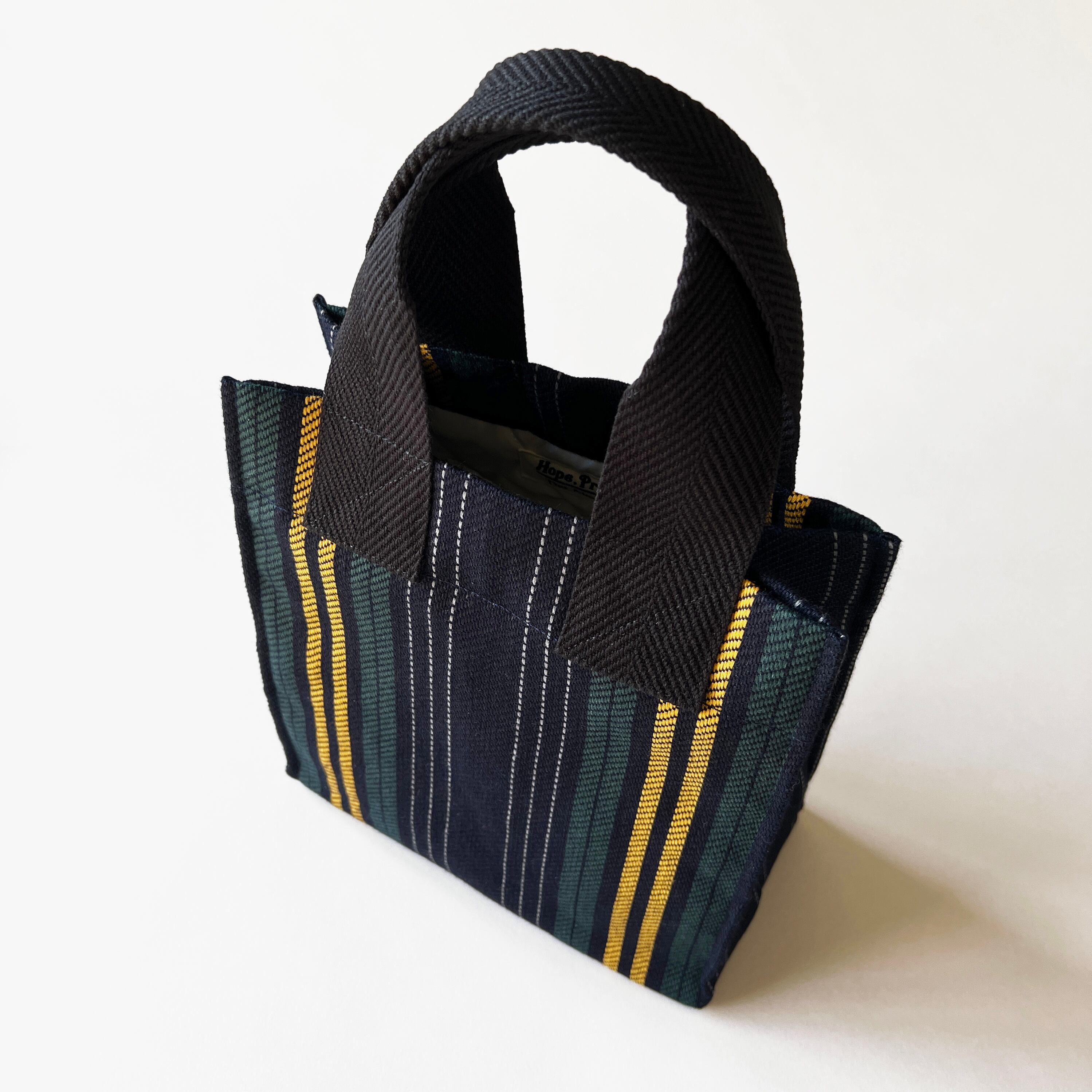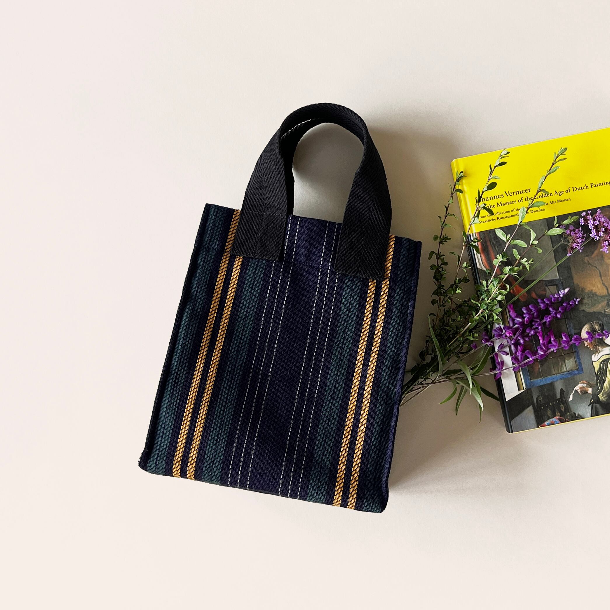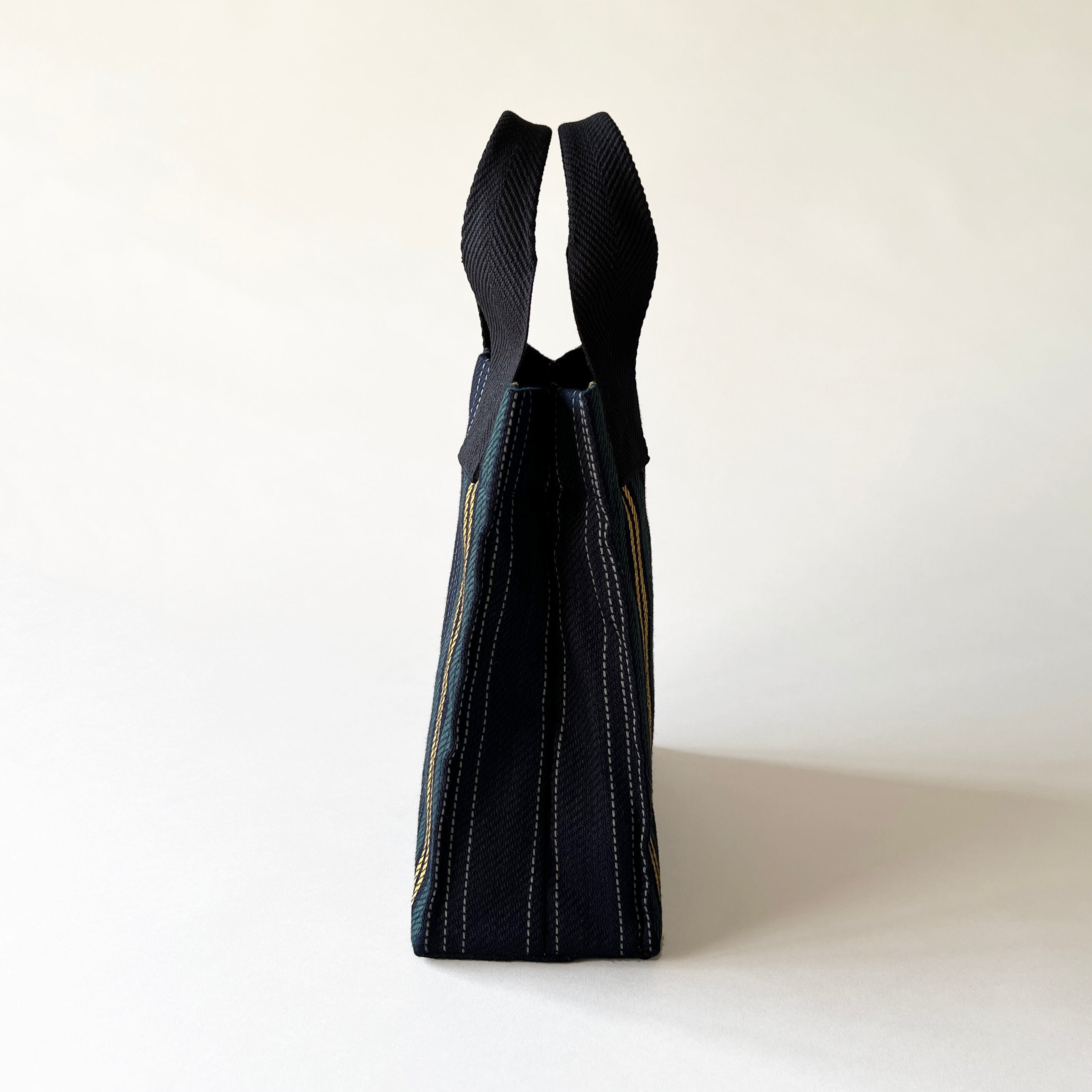 スタイリングのアクセントになる、シックなマルチストライプが印象的なトートバッグ。