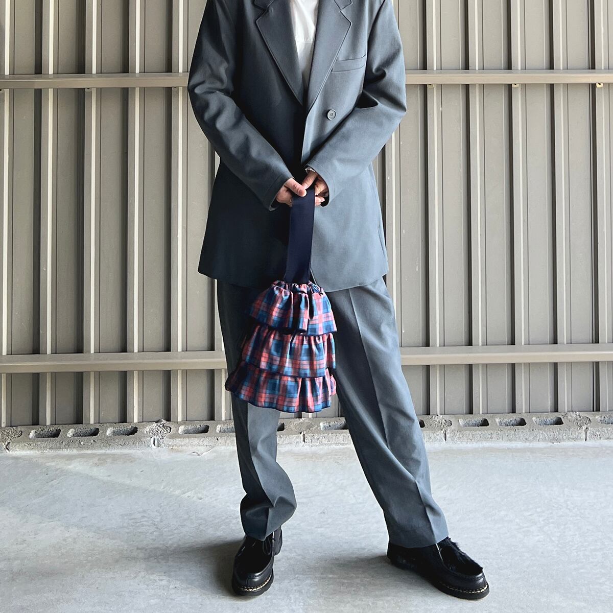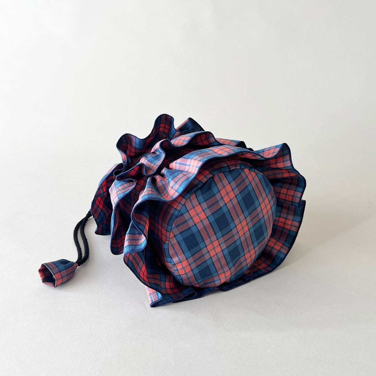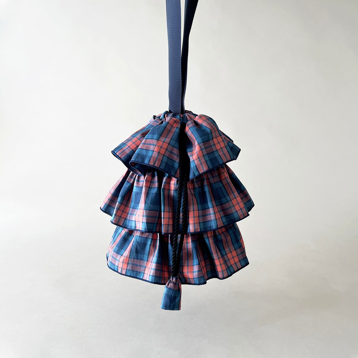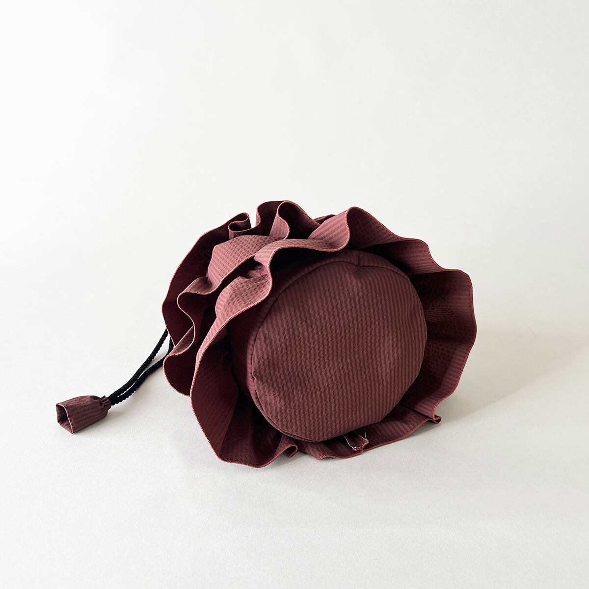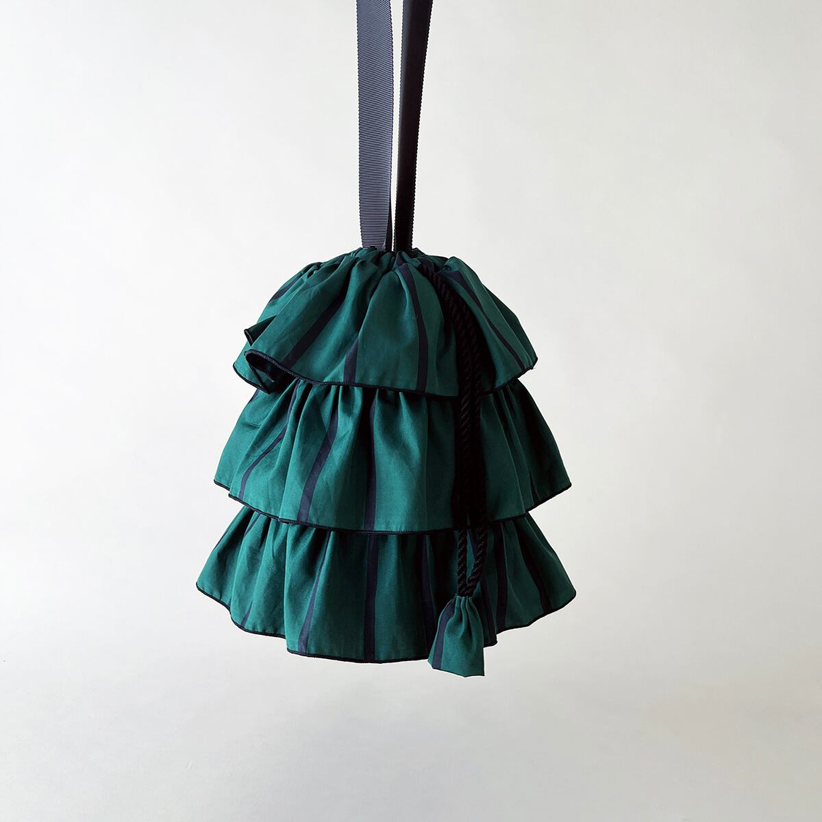 ティアードフリルによるふんわりとしたフォルムが可愛らしいドローストリングミニバッグ。