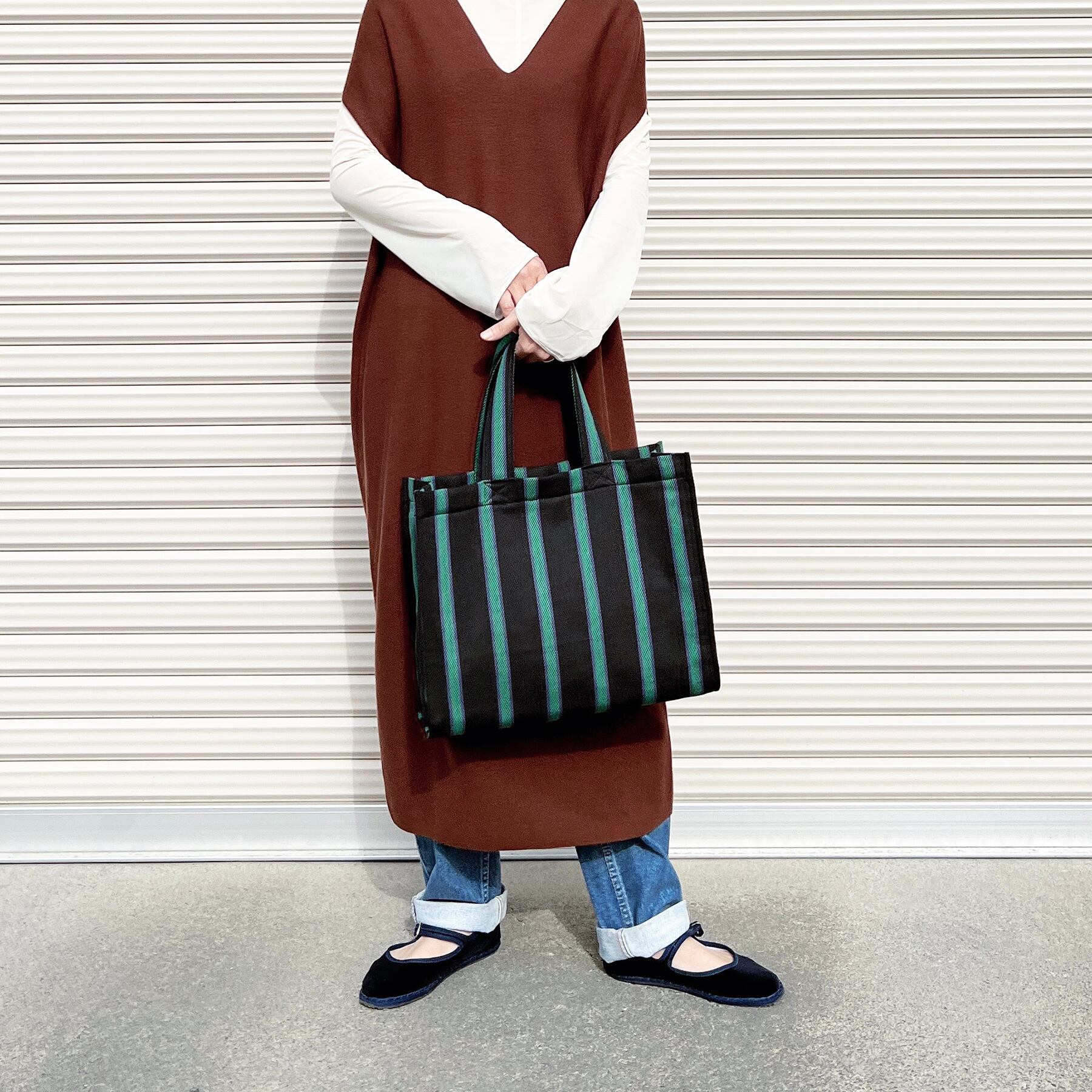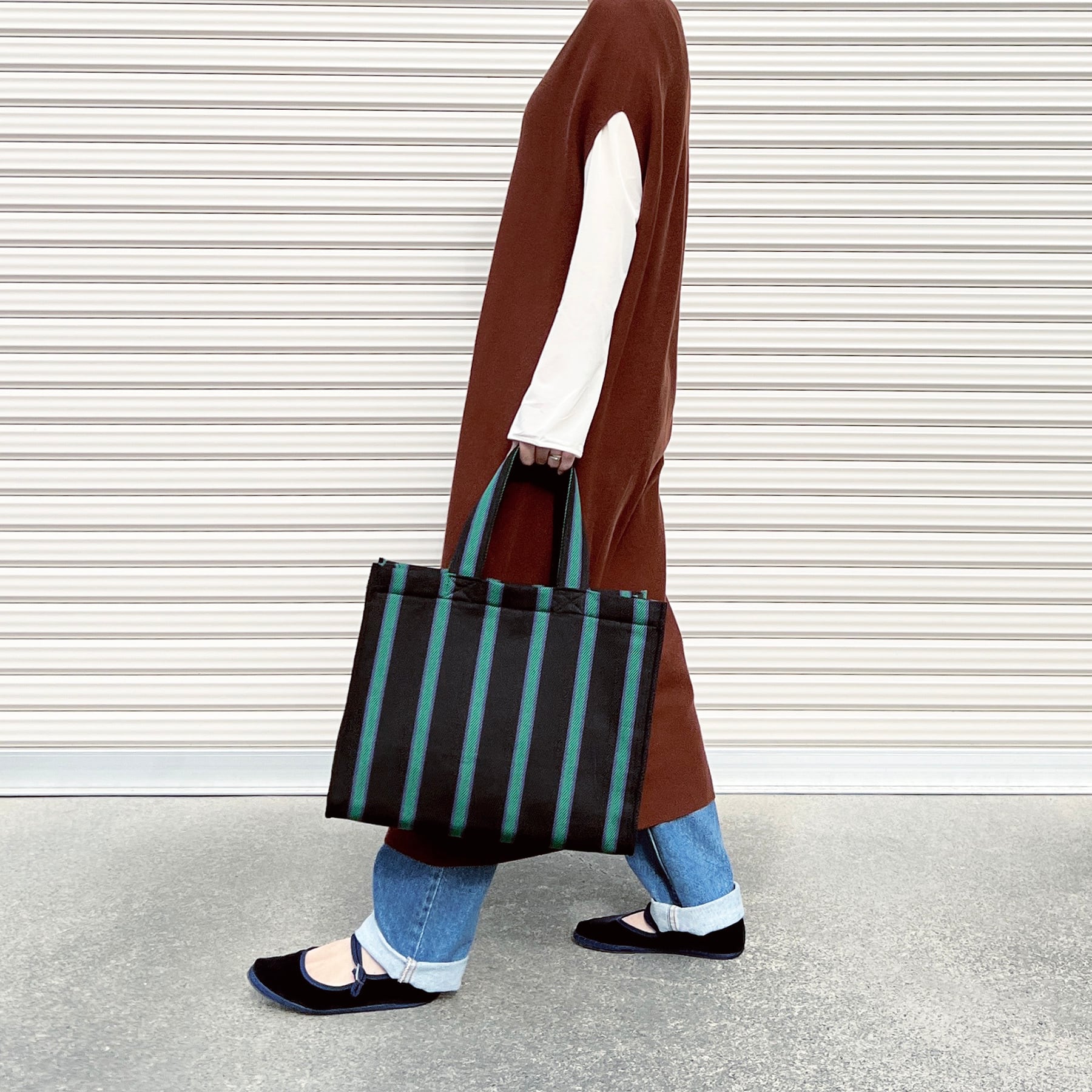 落ち着いたカラーリングが魅力的なストライプのトートバッグです。