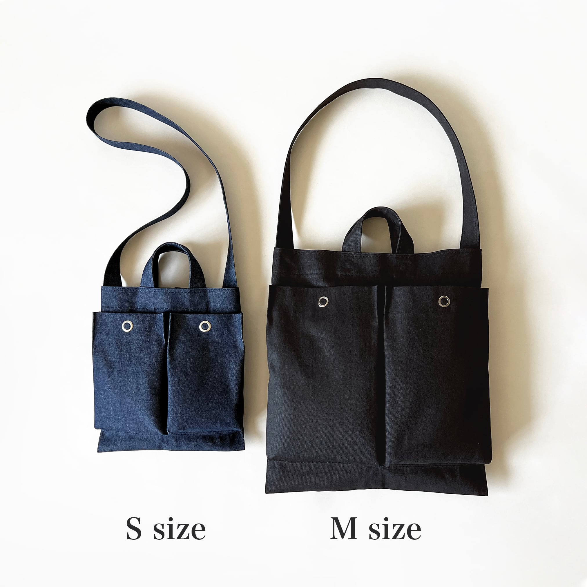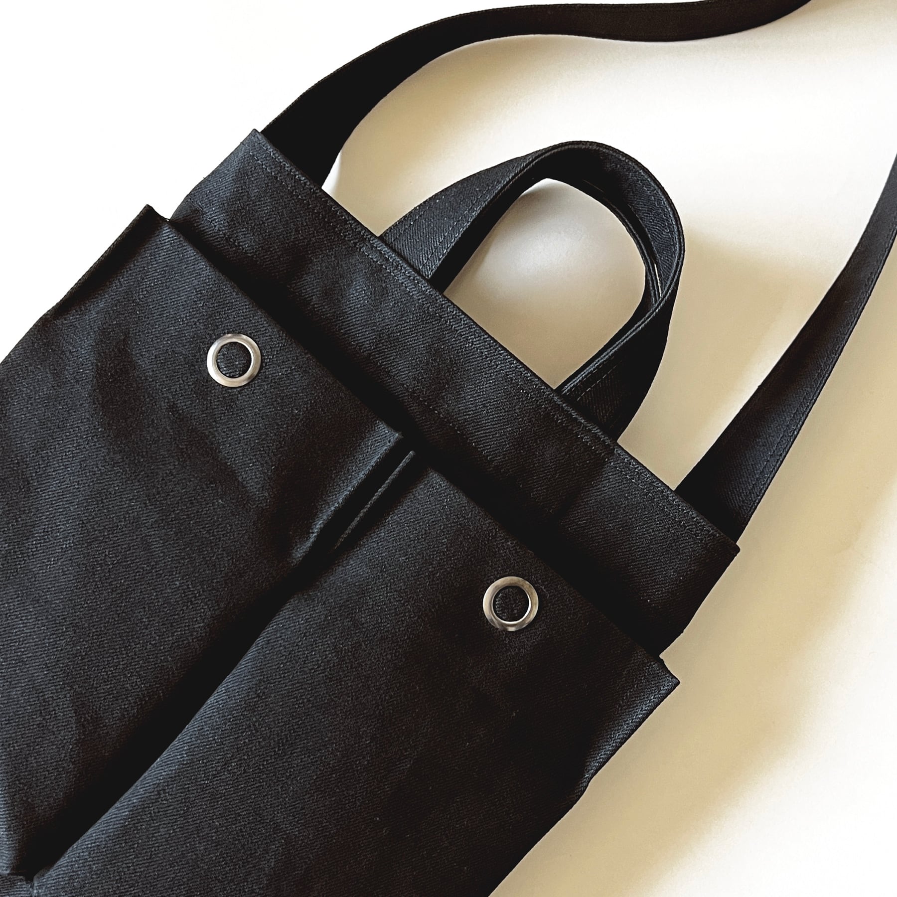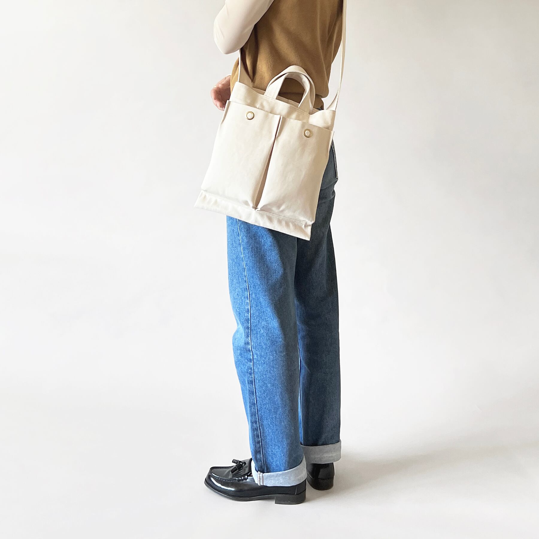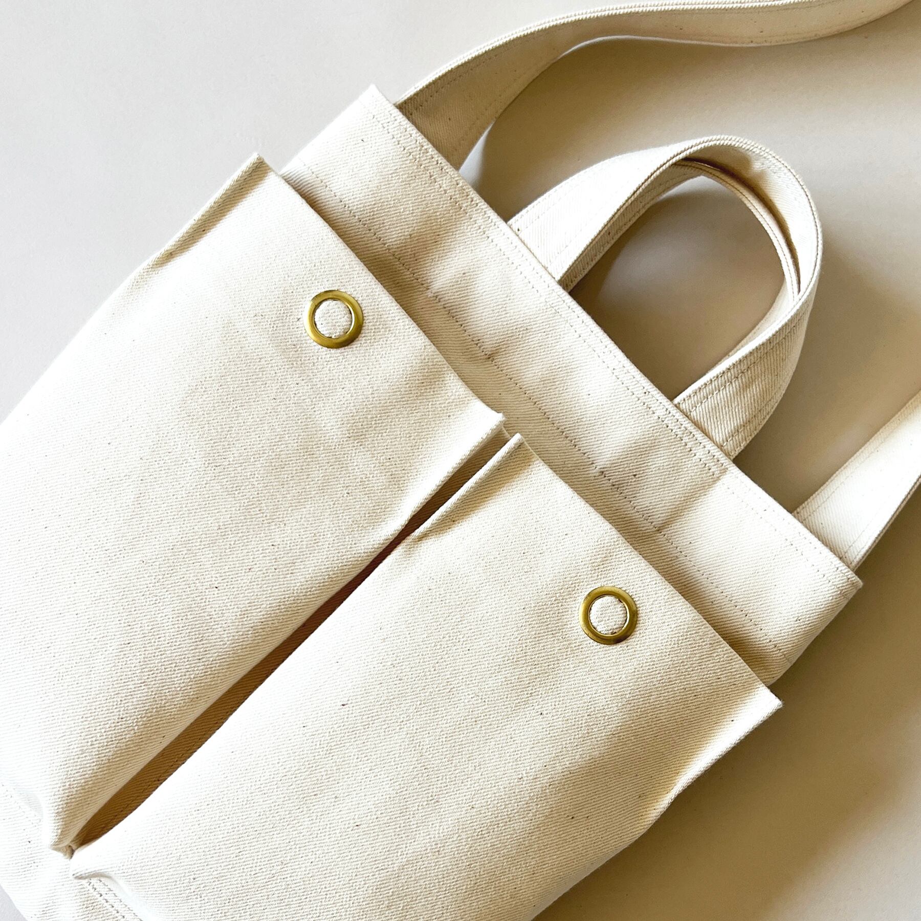 ミリタリーの定番アイテム、ヘルメットバッグをモチーフに、ミニマルで上品な印象に落とし込んだショルダーバッグ。