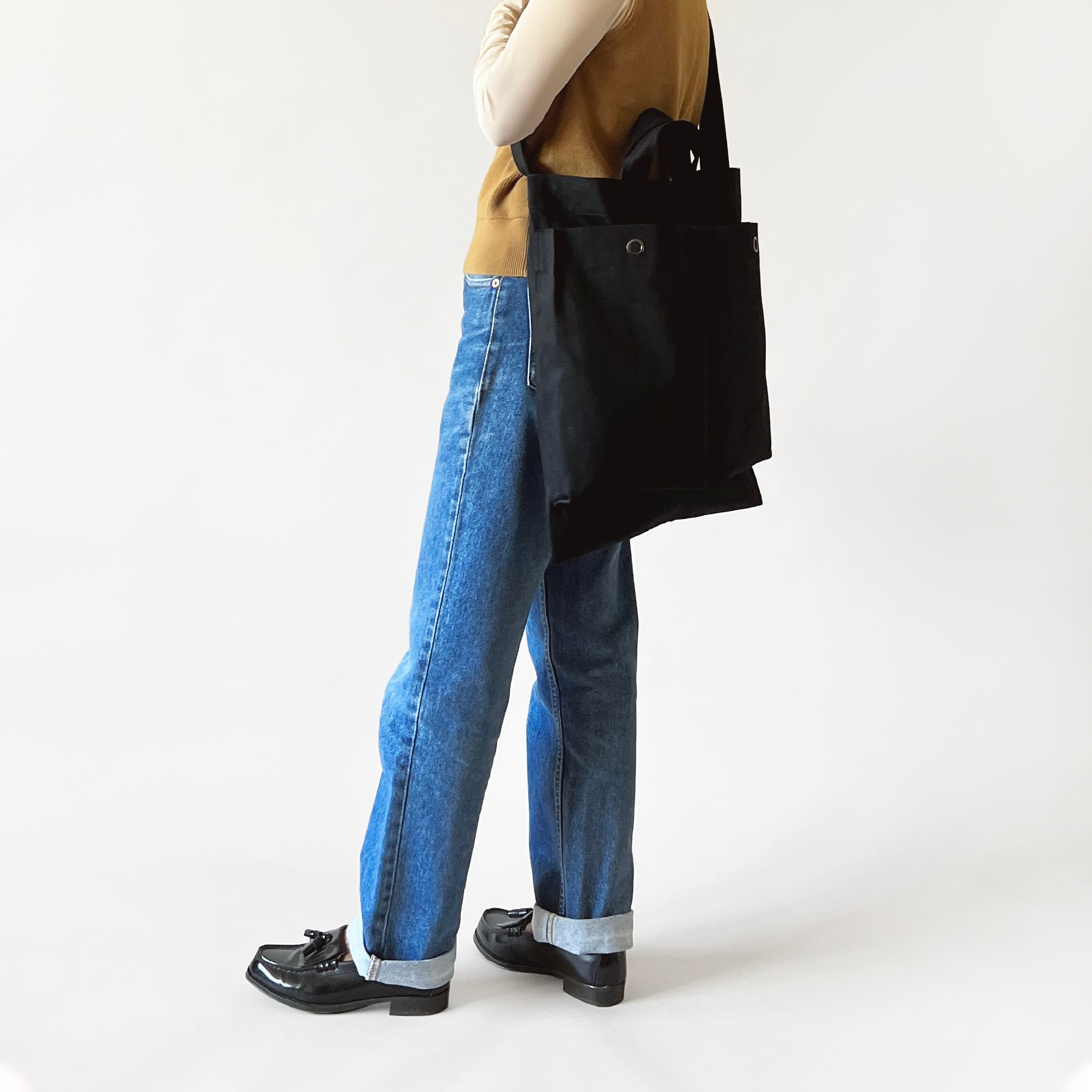 素材はクリアな表面感で、きれいめな印象に織られた国産デニムを使用。しっかりとしたオンスのデニムでありながら、しなやかさと上品な光沢感があるのがポイントです。
