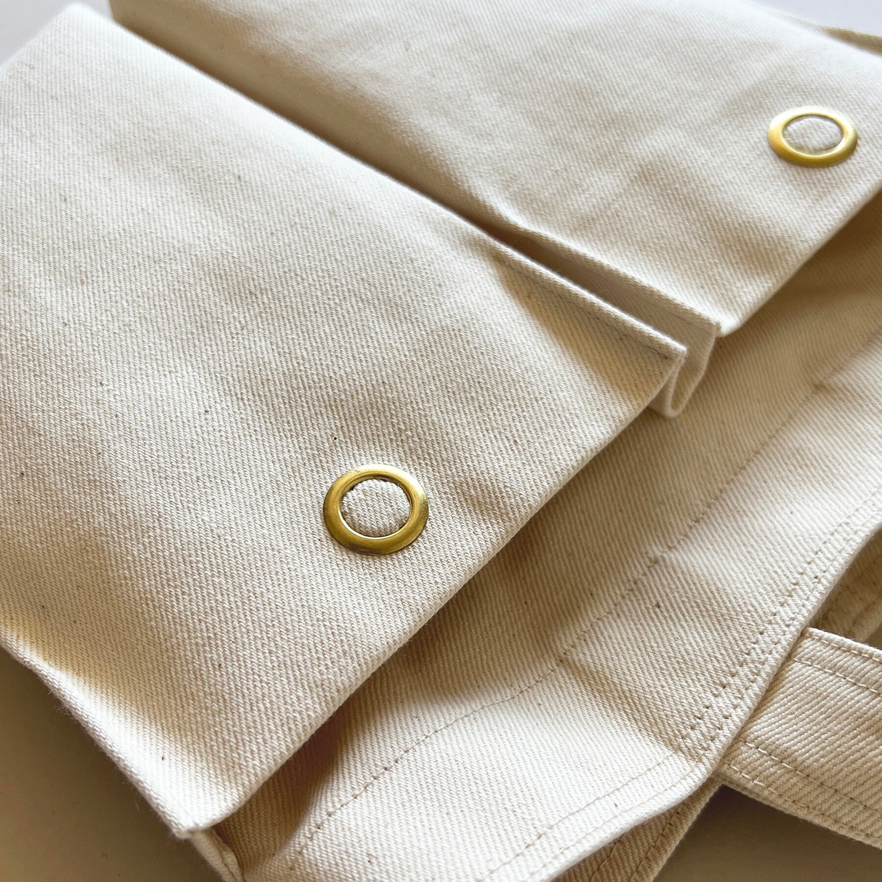 フロントポケットに付いた大きめのフラットリングボタンがさりげないアクセントに。