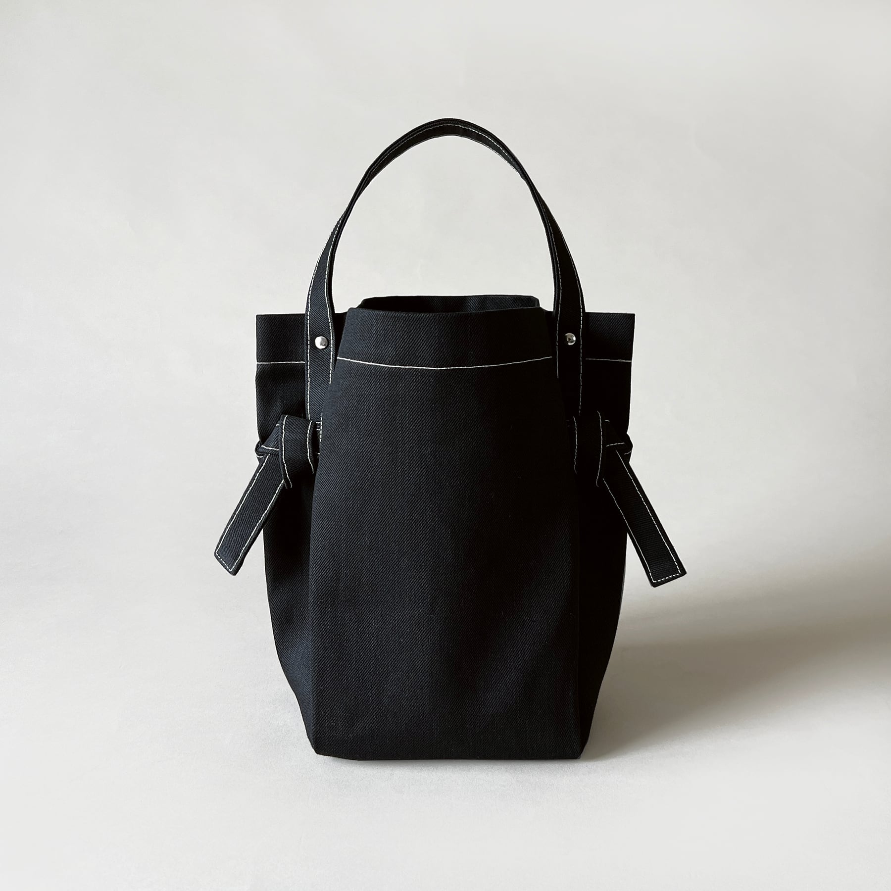 構築的なフォルムが印象的な、ミドルサイズのワンハンドル バケットバッグ。
