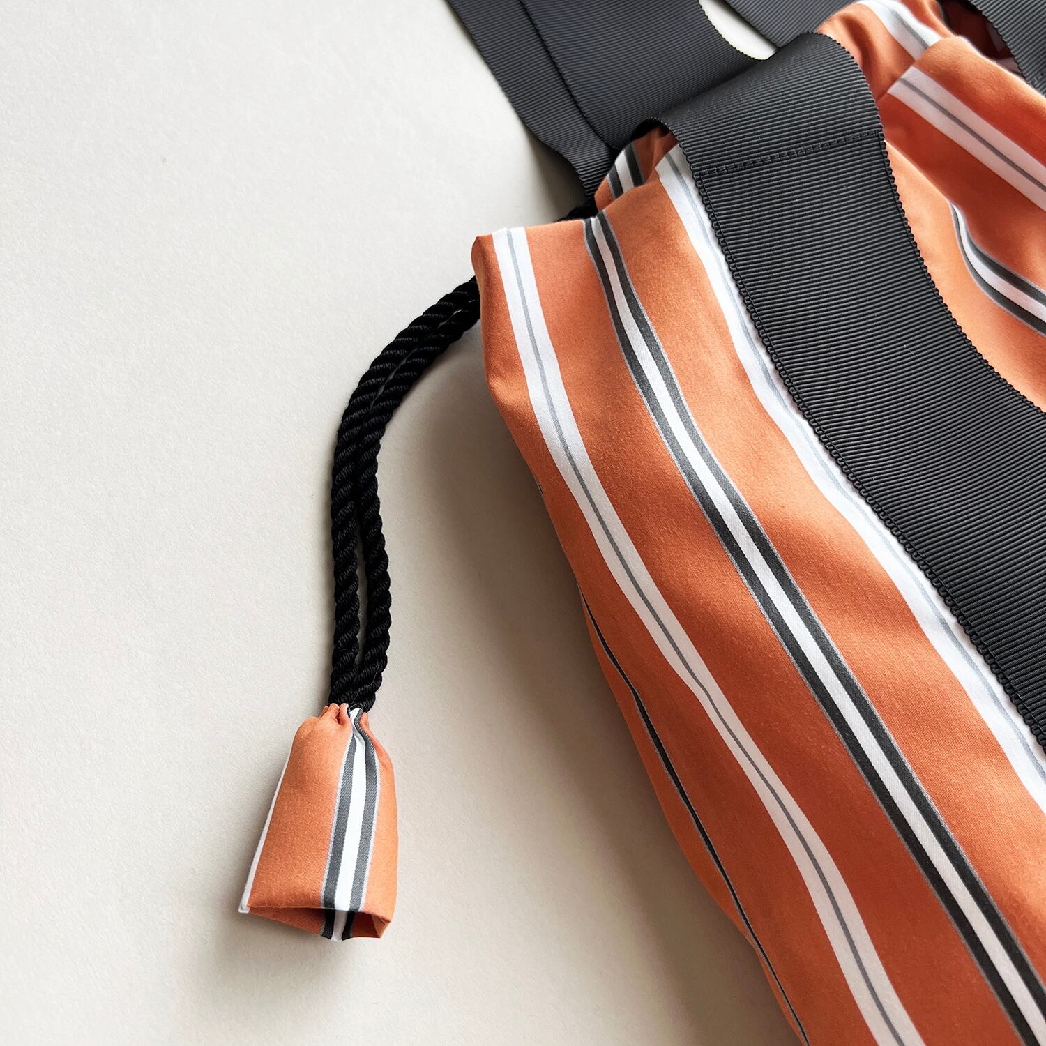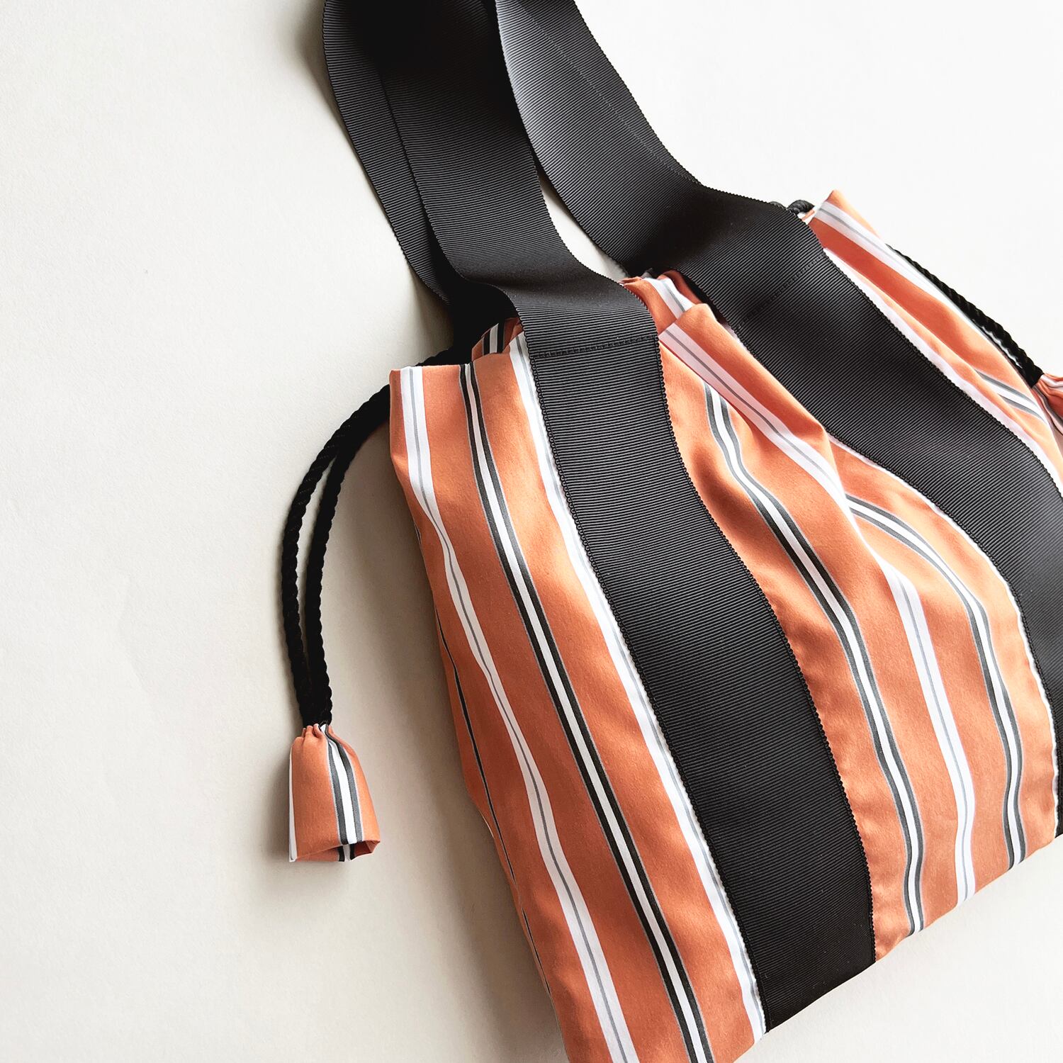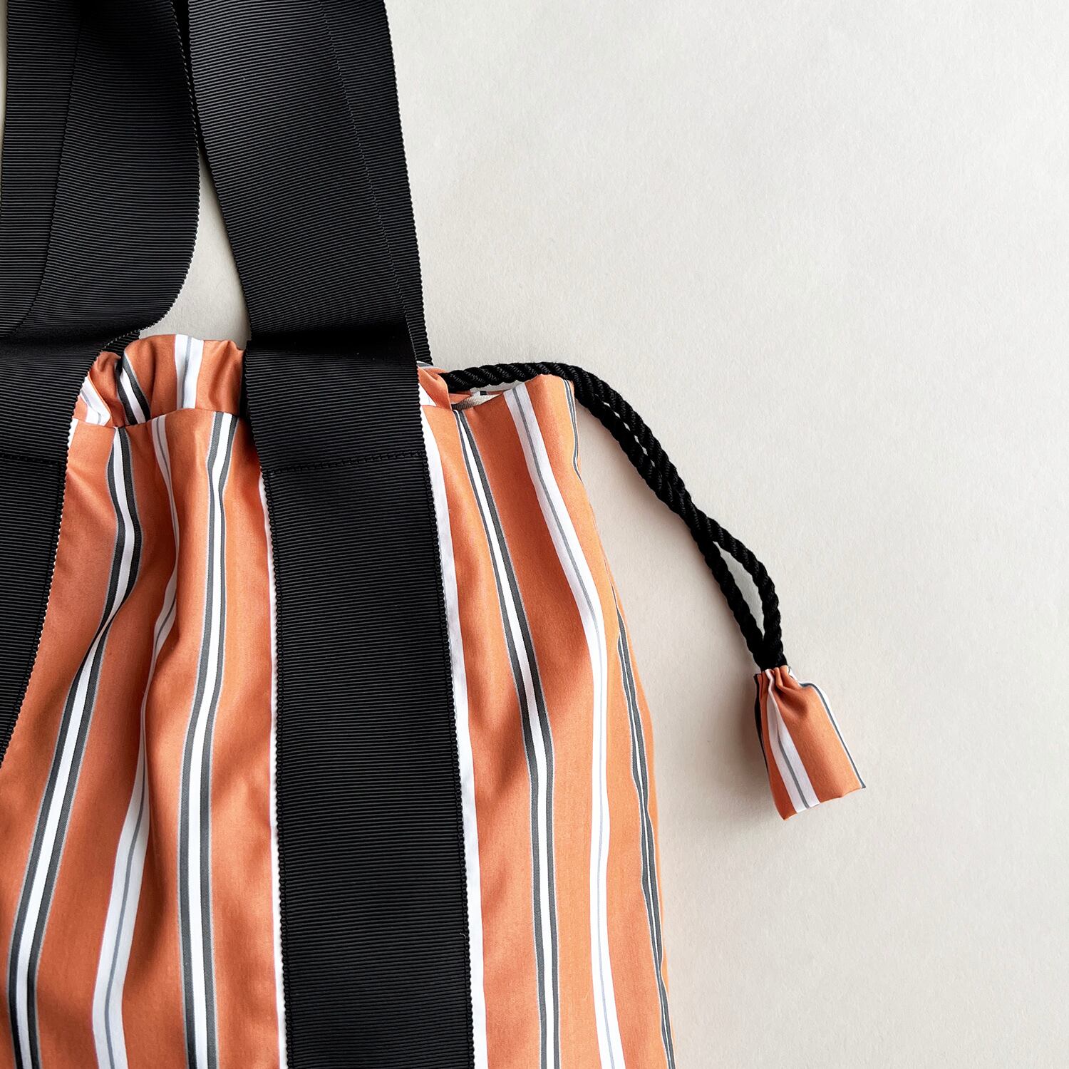 気分が上がるサンセットオレンジカラーのストライプ柄巾着バッグ。